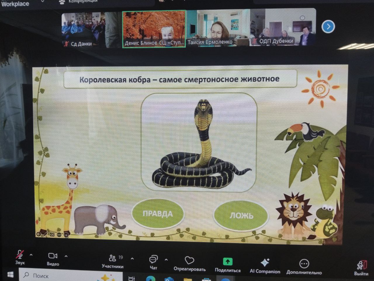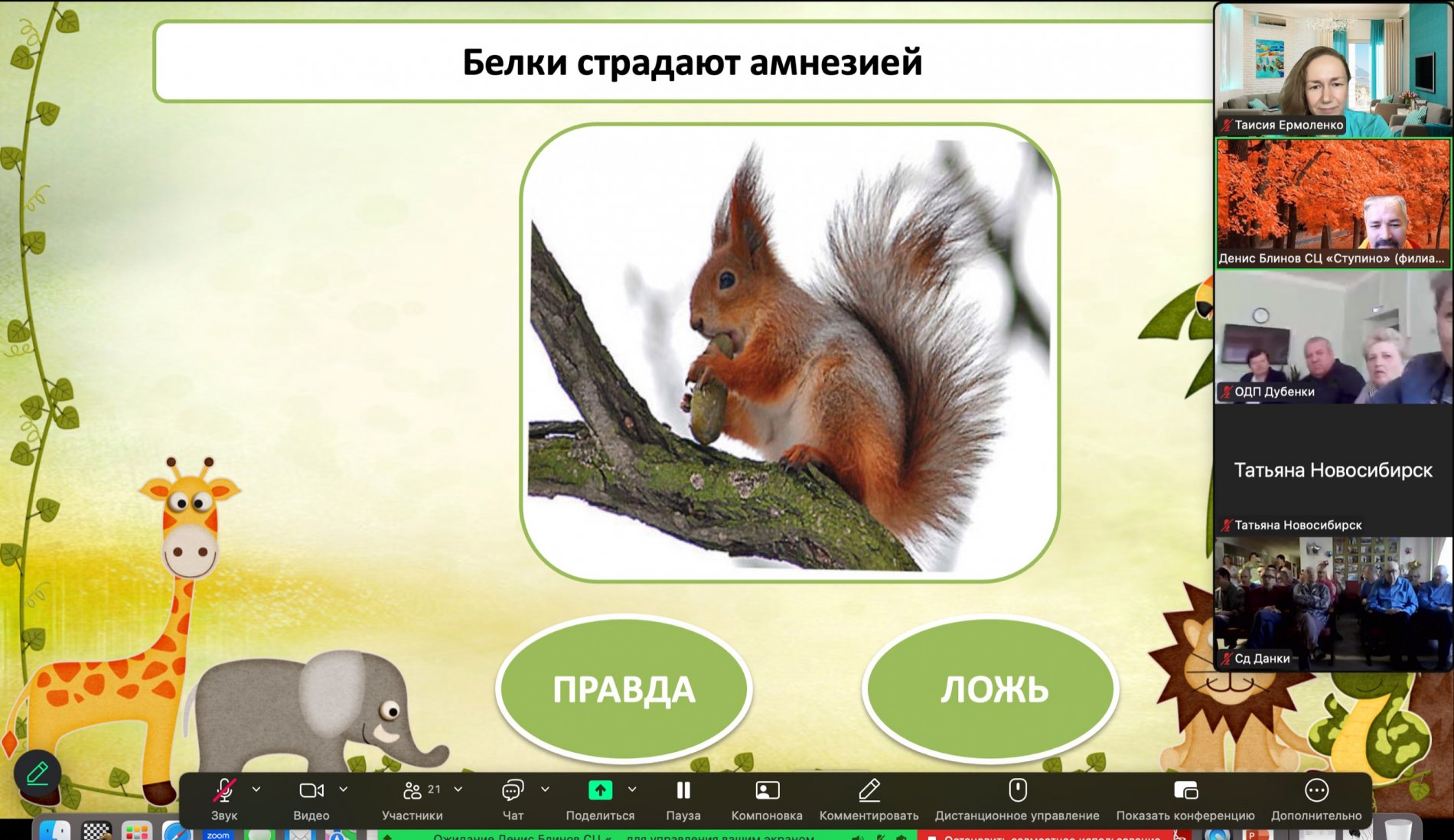 Сегодня Денис провёл увлекательную онлайн-викторину «В мире животных» совместно с БФ «Старость в радость». Участниками стали более ста жителей социальных учреждений нашей страны: Карелии, Мордовии, Башкортостана, Владимирской, Псковской, Ивановской, Ростовской, Тульской, Самарской, Ярославской, Новосибирской областей, Краснодарского и Красноярского краёв. Участники в прямом эфире боролись за звание знатока фауны.