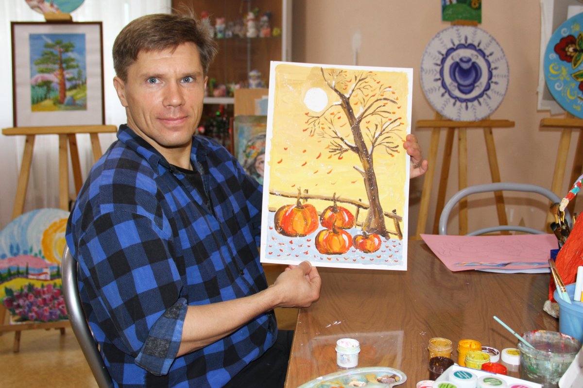 «Я рисовал тыквы и дерево, как в осеннем огороде. Старался, чтобы было красиво. Мне сказали, что получилось хорошо — я рад», — поделился Жарцов Руслан, житель.