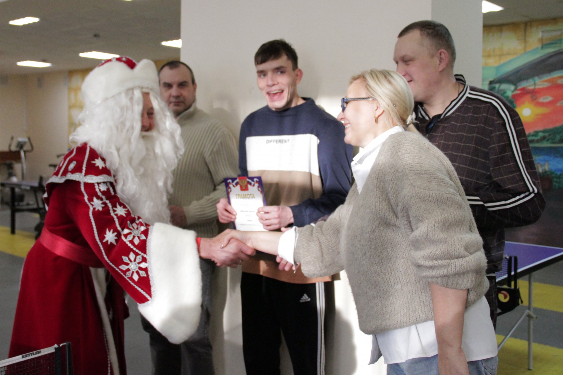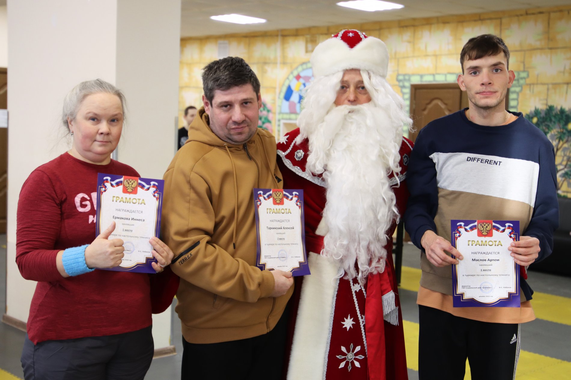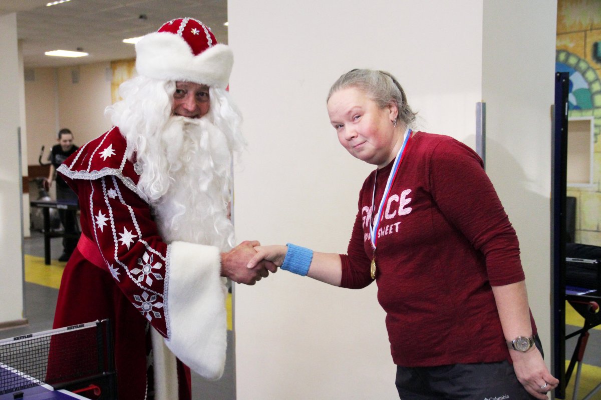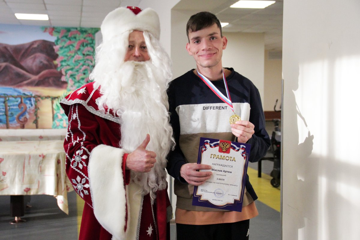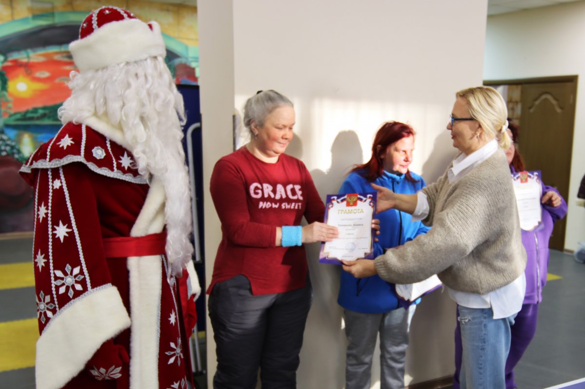 Торжественным моментом мероприятия стало награждение победителей и призёров. С тёплыми словами поздравлений к участникам обратилась начальник отдела реабилитации Татьяна Полякова, подчеркнув важность таких событий для укрепления физического здоровья, командного духа и уверенности в себе. К поздравлениям присоединился и Дед Мороз, который поддержал спортсменов добрыми пожеланиями, праздничным настроением и верой в новые победы. Победителям и призёрам были вручены грамоты, а каждому участнику — слова благодарности за активность, стремление к победе и честную спортивную борьбу. Надо отметить, что медали победителям подарила выпускница нашего социального дома Мария Басова, которая, находясь у нас, много лет занимала первые места по данным видам спорта.