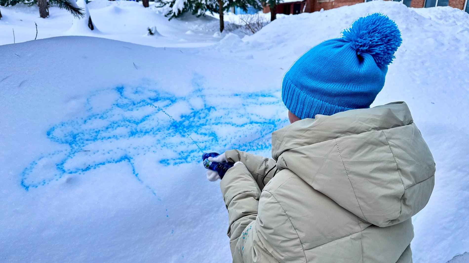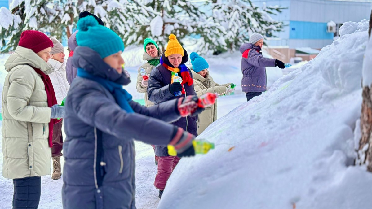 Творческое занятие прошло на свежем воздухе. В качестве холста участники использовали снег, а вместо кистей — бутылки с цветной водой, с помощью которых создавали яркие рисунки и узоры.